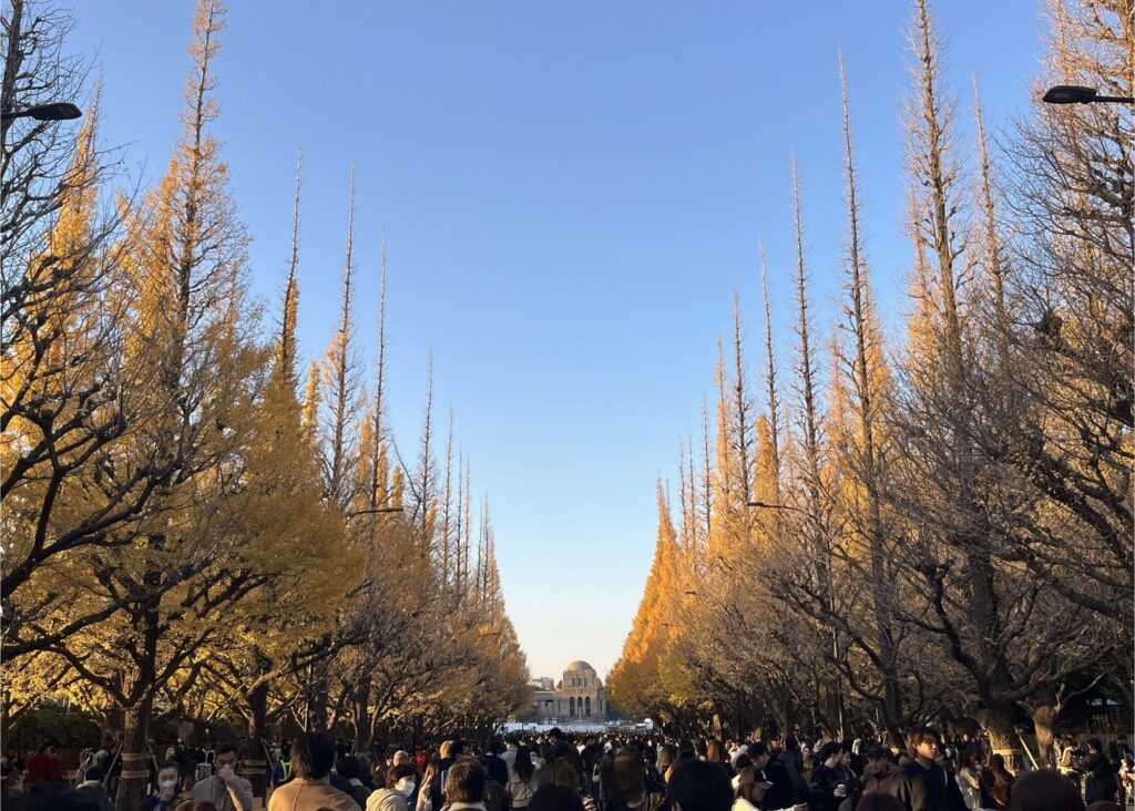 外苑前のいちょう並木の人だかりは、インバウンドの人であふれかえっていました。、